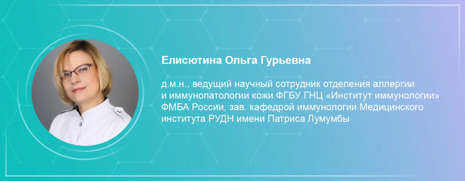 Елисютина Ольга Гурьевна д.м.н., ведущий научный сотрудник отделения аллергии и иммунопатологии кожи ФГБУ ГНЦ «Институт иммунологии» ФМБА России, зав. кафедрой иммунологии Медицинского института РУДН имени Патриса Лумумбы