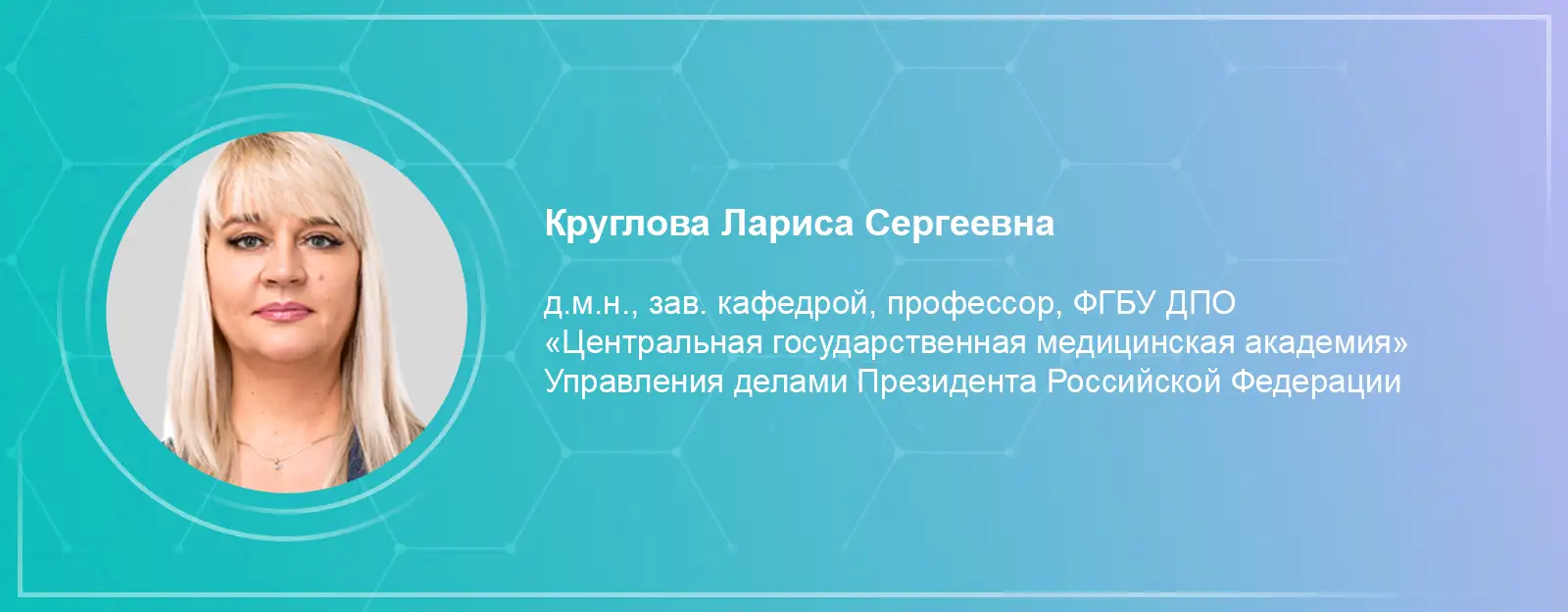 Круглова Лариса Сергеевна д.м.н., зав. кафедрой, профессор, ФГБУ ДПО «Центральная государственная медицинская академия» Управления делами Президента Российской Федерации