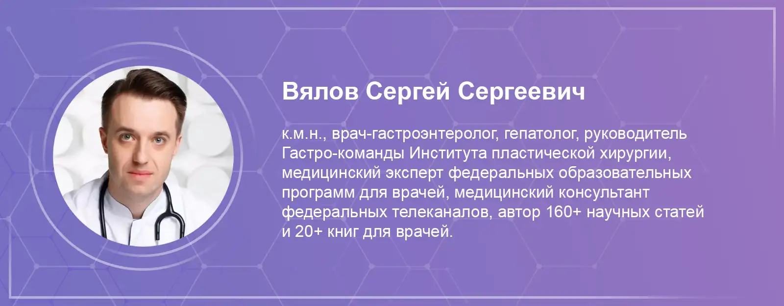 Рассуждает Сергей Сергеевич Вялов, к.м.н., врач-гастроэнтеролог, гепатолог, руководитель Гастро-команды Института пластической хирургии, медицинский эксперт федеральных образовательных программ для врачей, медицинский консультант федеральных телеканалов, автор 160+ научных статей и 20+ книг для врачей.