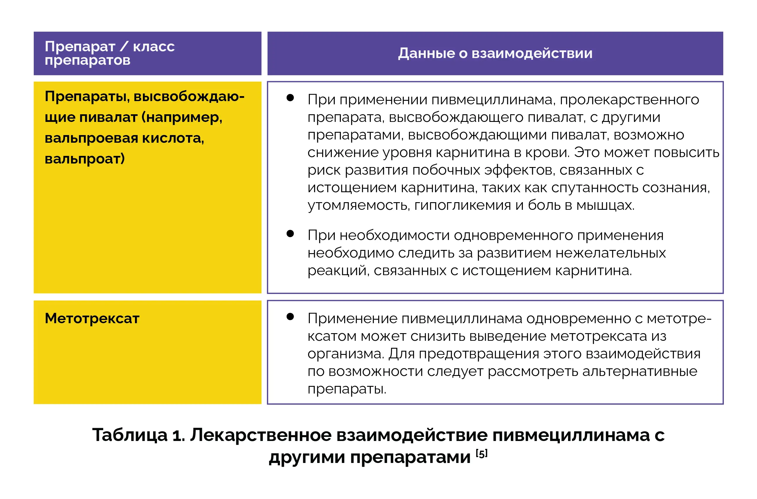 Данные о лекарственном взаимодействии пивмециллинама с другими препаратами обобщены в таблице 1.