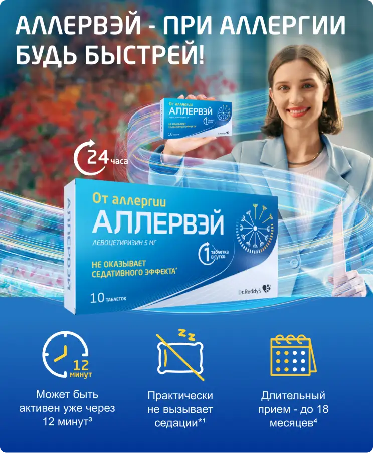 Аллервэй обладает доказанным выраженным противовоспалительным действием за счет снижения концентрации факторов адгезии в плазме крови [2] и может быть активен уже через 12 минут [3].