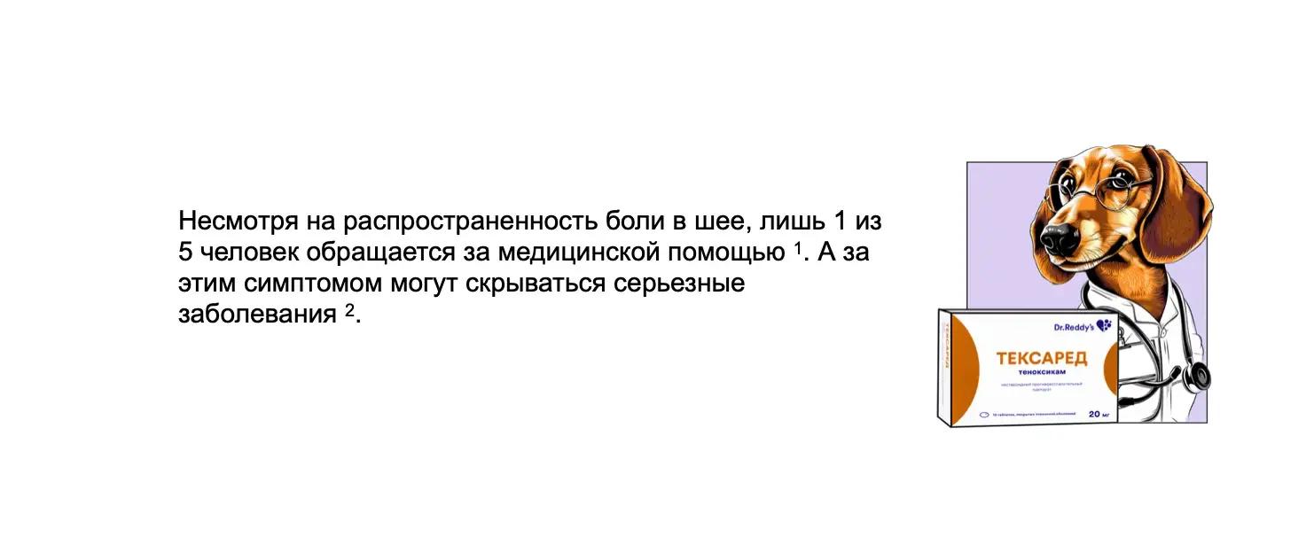 К наиболее широко применяемым препаратам для терапии боли в шее относят НПВП, которые обладают одновременно анальгезирующим и противовоспалительным действием2. Хорошо зарекомендовал себя препарат Тексаред®, который отличается высокой биодоступностью (100%), низким системным клиренсом и продолжительным периодом полувыведения, что позволяет использовать его один раз в сутки4.
