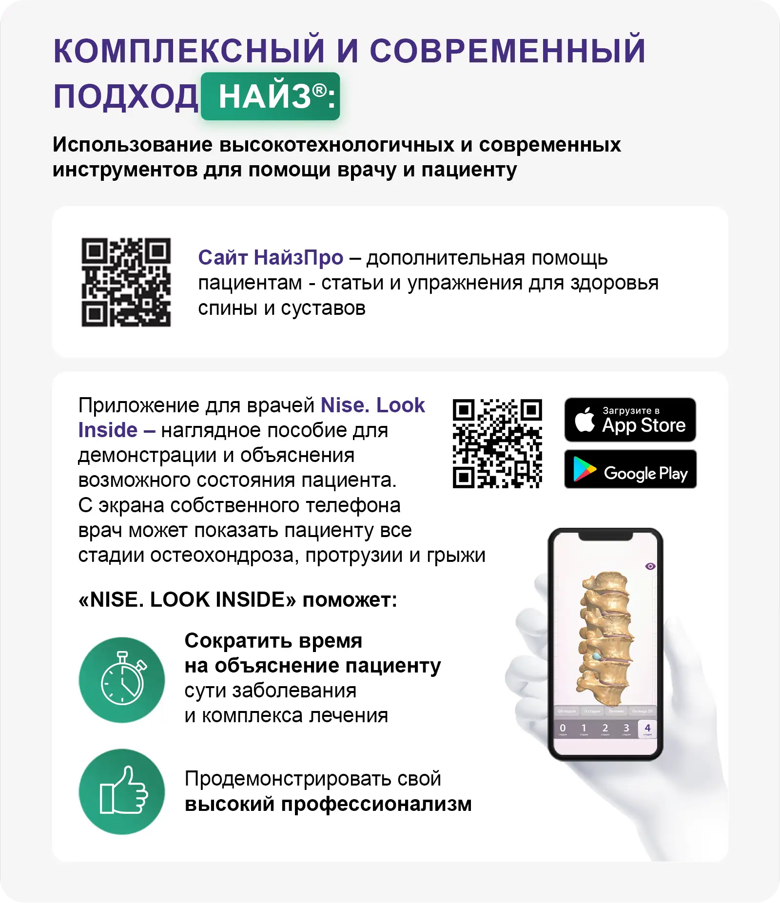 С помощью приложения «Найз.LookInside» вы сможете показать пациенту в 3D формате, как формируется межпозвоночная грыжа, и в какой момент развития патологии появляется боль. Визуализация поможет улучшить комплаентность терапии и подчеркнет ценность профилактики таких состояний. В приложении уже на стартовом экране можно самостоятельно выбрать нужный отдел разрушения позвоночного столба, представленного в 3D модели. Эта новейшая технология поможет обеспечить понятный и четкий алгоритм лечения в каждом конкретном случае.