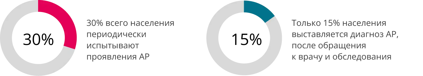По данным статистики примерно 30% всего населения может периодически испытывать проявления АР. Однако официальный диагноз после обращения к врачу и обследования выставляется всего 15%. Этот факт связывают с тем, что большинство людей не обращается к специалистам¹.