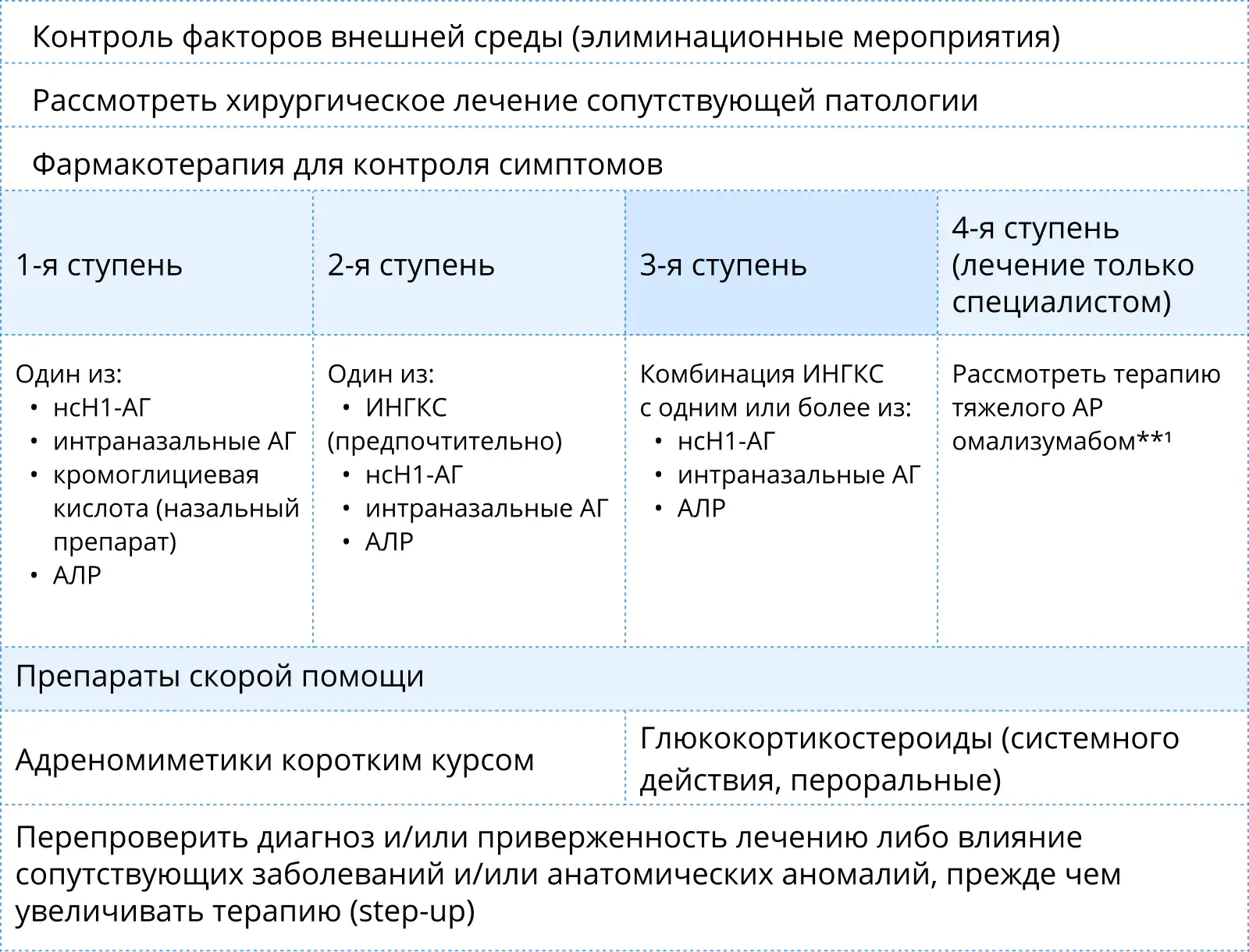 Ступенчатая схема терапии аллергического ринита. Клинические рекомендации «Аллергический ринит» (2022)⁵