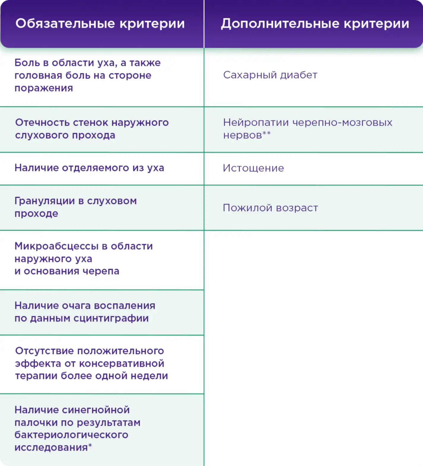 Таблица: диагностические критерии злокачественного наружного отита⁸ ⁹: