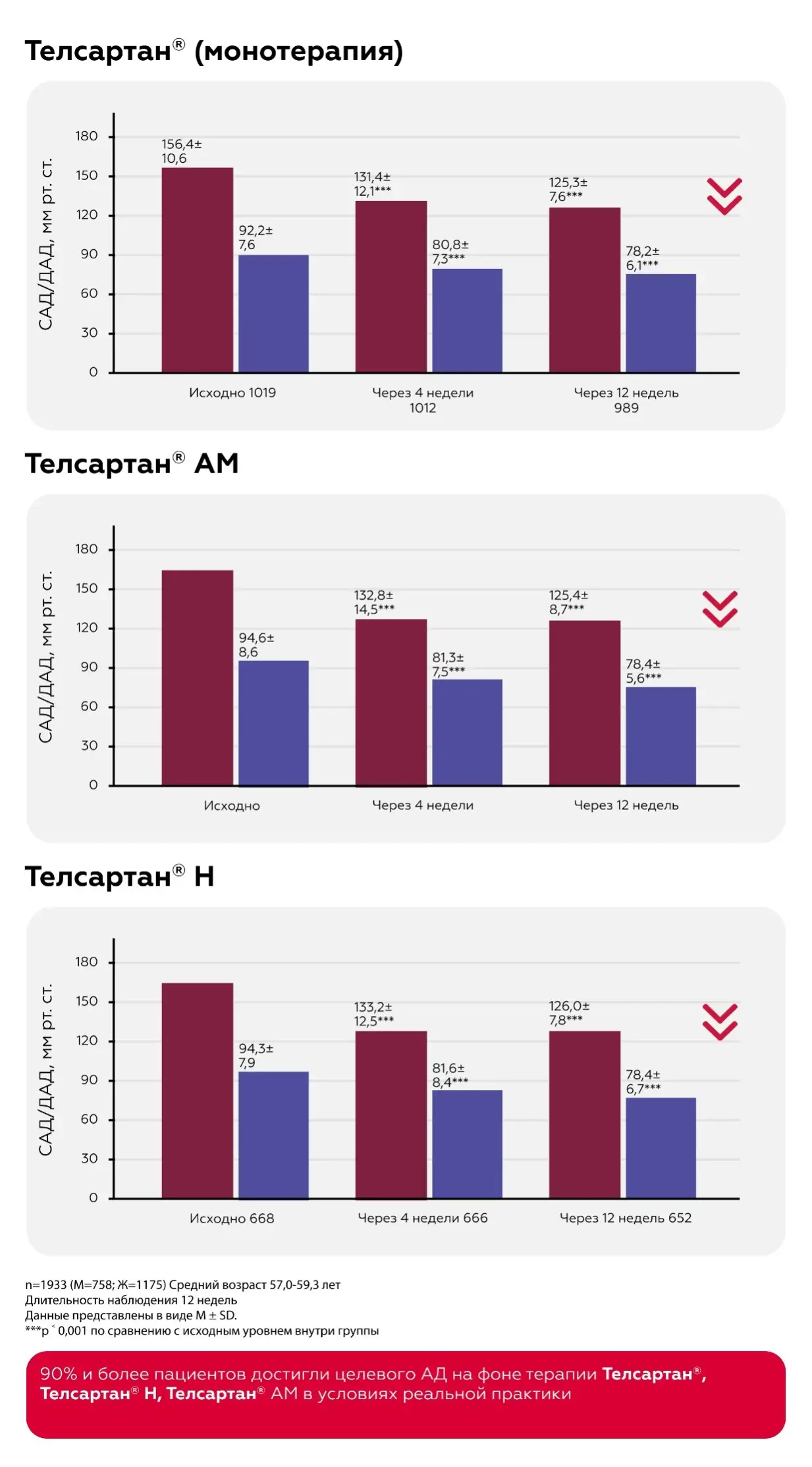 • Как в монотерапии, так и в комбинациях демонстрирует достижение целевого уровня АД примерно у 90% пациентов (рис. 1)⁸.