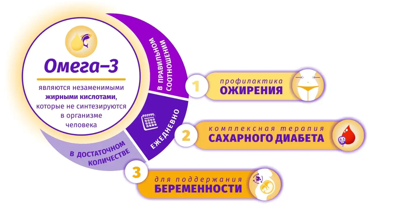 В настоящее время Омега-3 используются в профилактике и комплексной терапии таких патологических состояний, как ожирение, сахарный диабет, а также для поддержания процесса беременности [1, 2].