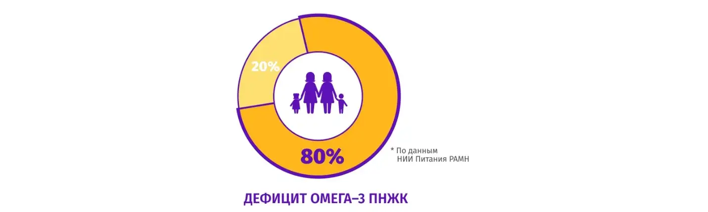 Омега–3 являются незаменимыми жирными кислотами, которые не синтезируются в организме человека. Крайне важно получать их ежедневно в достаточном количестве и правильном соотношении. По данным НИИ Питания РАМН дефицит потребления Омега–3 ПНЖК у большей части детского и взрослого населения России составляет около 80% [1].