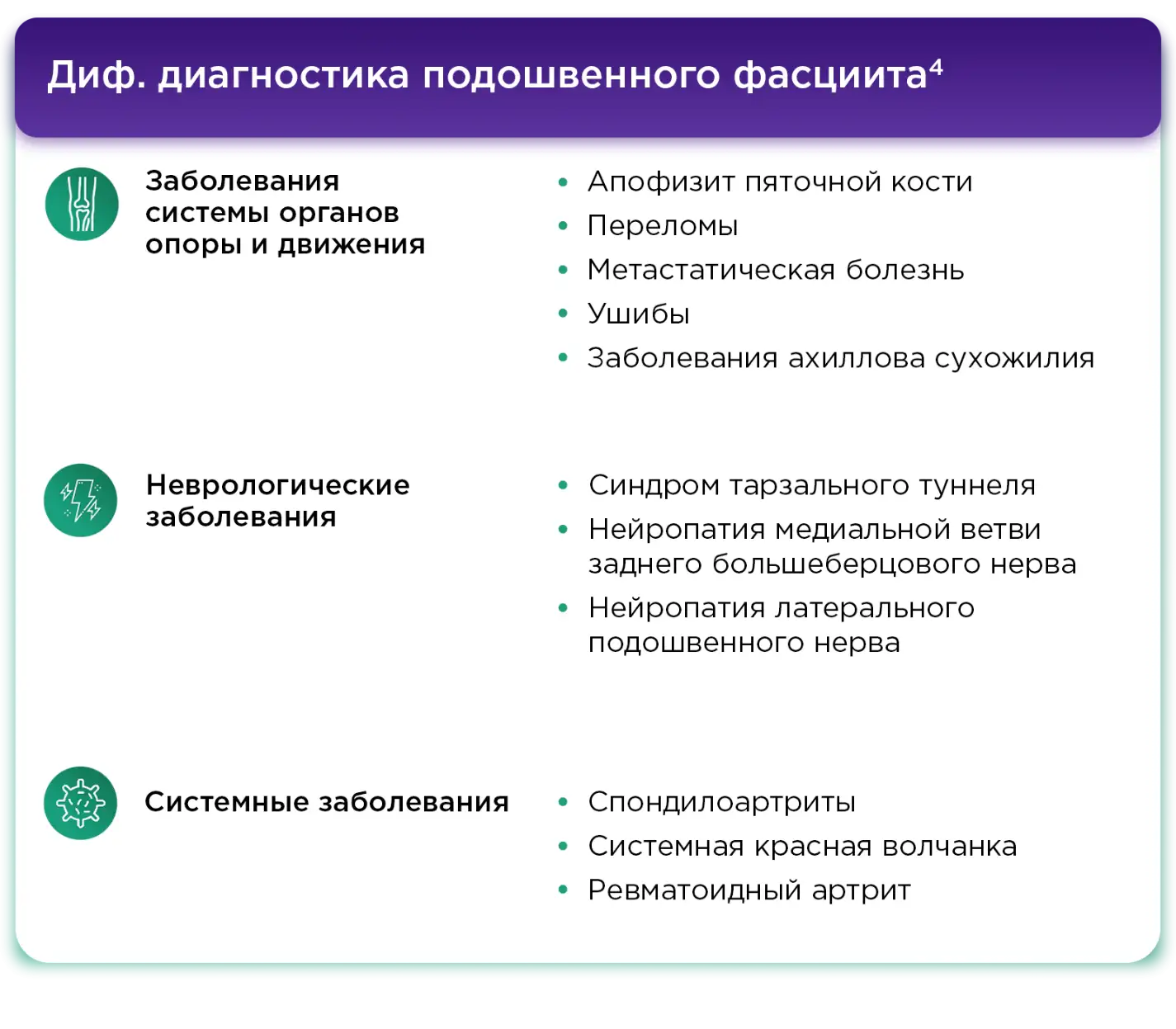 При атипичном анамнезе и локализации боли вне центральной и медиальной части пятки стоит провести дифференциальную диагностику.