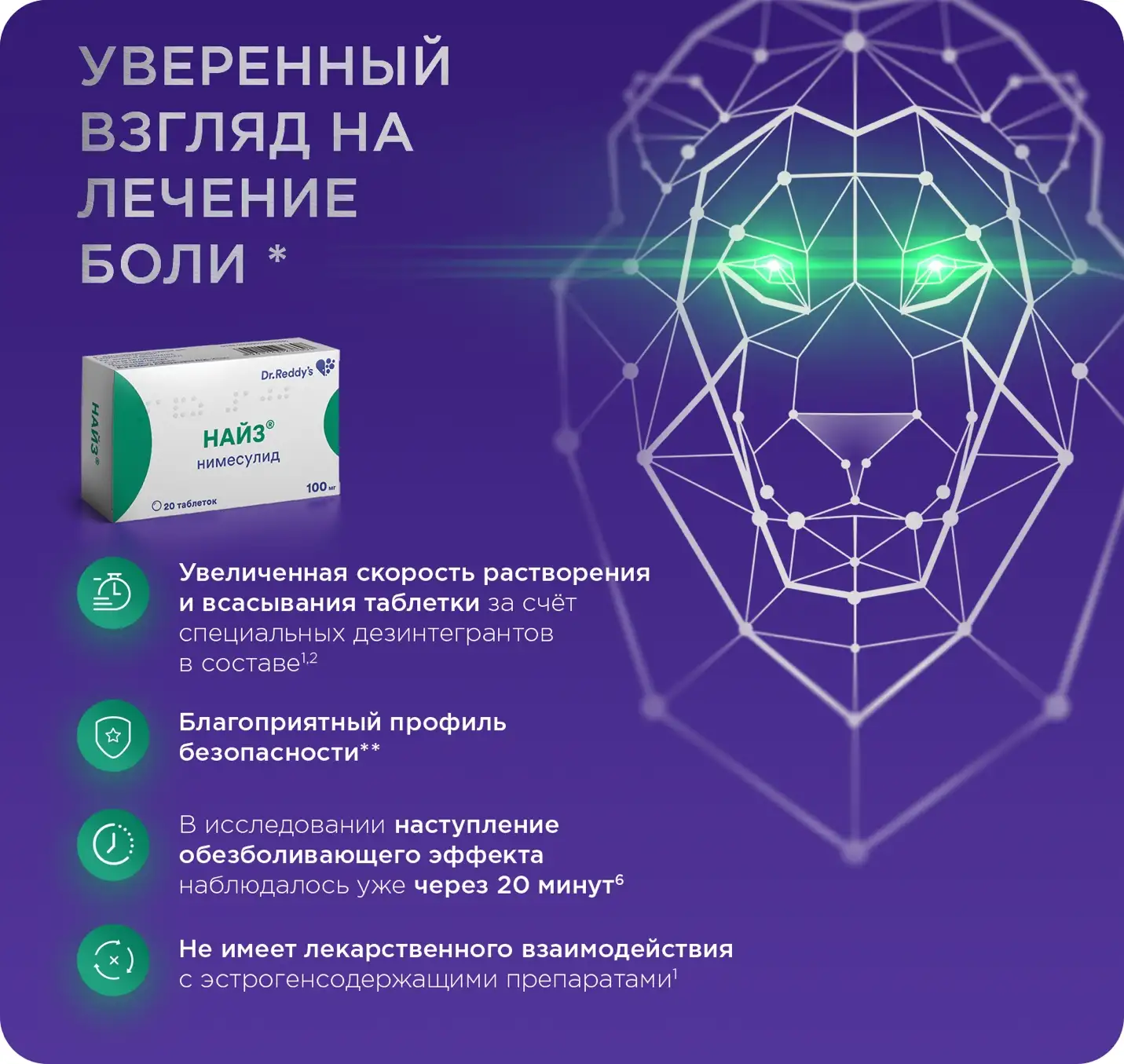 *Найз® 100 мг зарегистрирован в РФ 19.08.1998г. РУ NoП N 012824/03 и является лидером по продажам в упаковках среди нимесулидов для перорального приема, IQVIA 2023, Россия. H.G. Kress, A. Baltov, A. Basiński, F. Berghea, J. Castellsague, C. Codreanu, E. Copaciu, M.A. Giamberardino, M. Hakl, L. Hrazdira, M. Kokavec, J. Lejčko, L. Nachtnebl, R. Stančík, A. Švec, T. Tóth, M.V. Vlaskovska и J. Woroń (2016). Acute pain: a multifaceted challenge - the role of nimesulide. Current Medical Research and Opinion, 2016, 32(1), 23-36. DOI: 10.1185/03007995.2015.1100986.