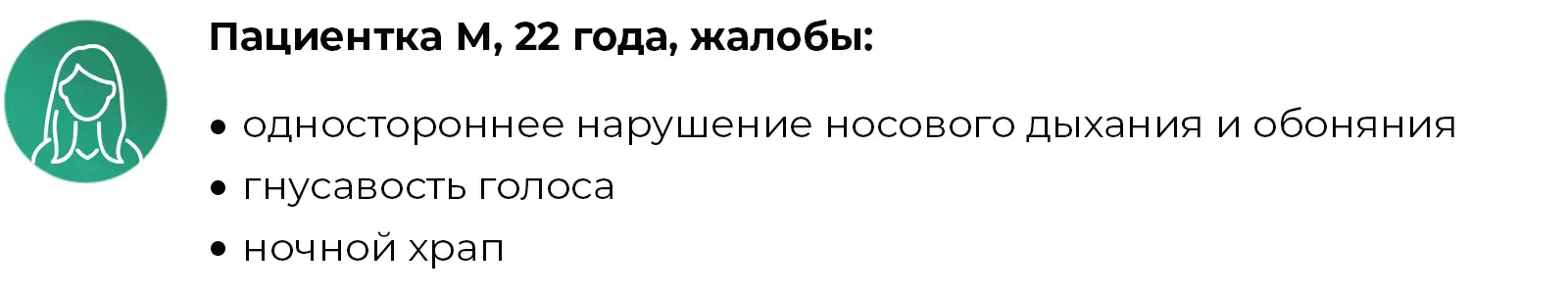 Жалобы длительные (в течение всей сознательной жизни). Объективно при осмотре: признаки искривления перегородки носа. Была назначена и проведена септопластика. В течение недели после операции испытывает боли и отечность в районе околоносовых пазух, а также повышение температуры до 38˚С. Рекомендации по уходу за носовой полостью и ограничению физической активности не соблюдала.