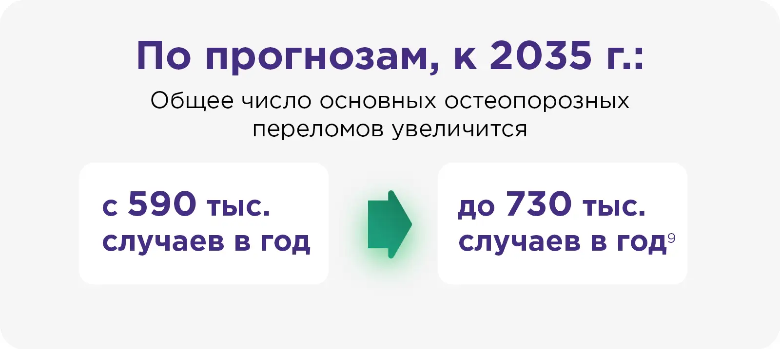 Остеопороз регистрируется у каждой третьей женщины и каждого четвертого мужчины в возрасте 50 лет и старше. Каждую минуту в стране происходит 7 переломов позвонков, а каждые 5 минут – перелом проксимального отдела бедренной кости⁹.