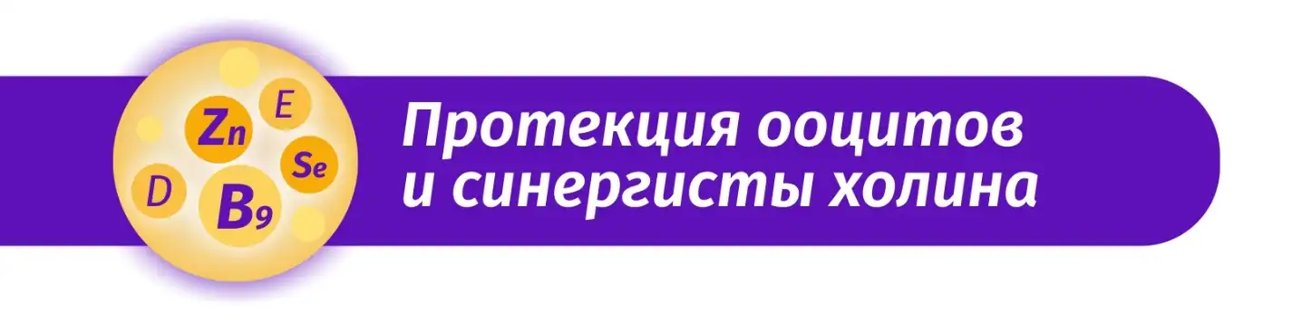 Холин также способствует протекции ооцитов. Известно, что к наиболее информативным метаболитам фолликулярной жидкости, позволяющим прогнозировать качество ооцитов, относятся производные холина⁴. Его синергисты: фолаты, цинк, селен, витамины E и D, способствуют созреванию ооцитов и развитию эмбрионов¹.