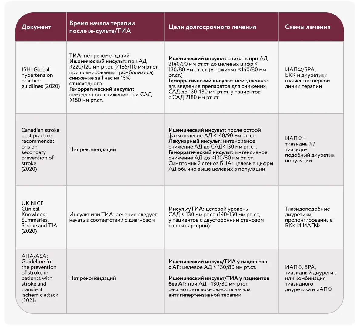 Кардиологические сообщества разных стран в своих рекомендациях прописывают различные варианты ведения пациентов с артериальной гипертензией после инсульта или транзиторной ишемической атаки. Предлагаем Вам ознакомиться с основными различиями. [2]