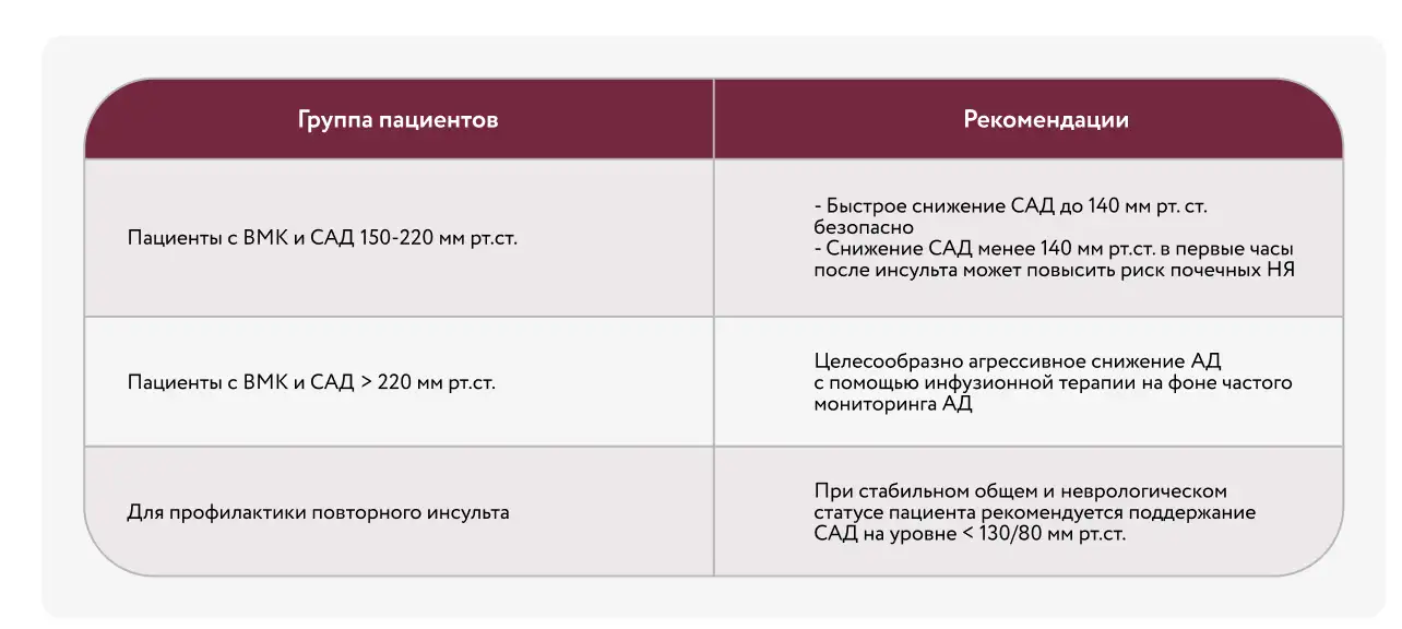 По мнению экспертов из международного общества по борьбе с гипертонией и по данным канадских рекомендаций по борьбе с инсультом (Canadian stroke best practice recommendations), если речь идет о геморрагическом или лакунарном инсультах, то цифры САД рекомендуется держать ниже 130 мм рт.ст., если об ишемическом инсульте, то ниже 140 мм рт.ст.