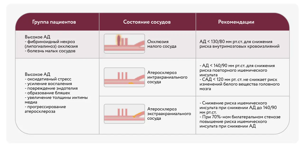 В случае интракраниального или экстракраниального атеросклероза с уменьшением диаметра и проходимости сосуда, снижении скорости кровотока, АД необходимо снижать менее 140/90 мм рт. ст.