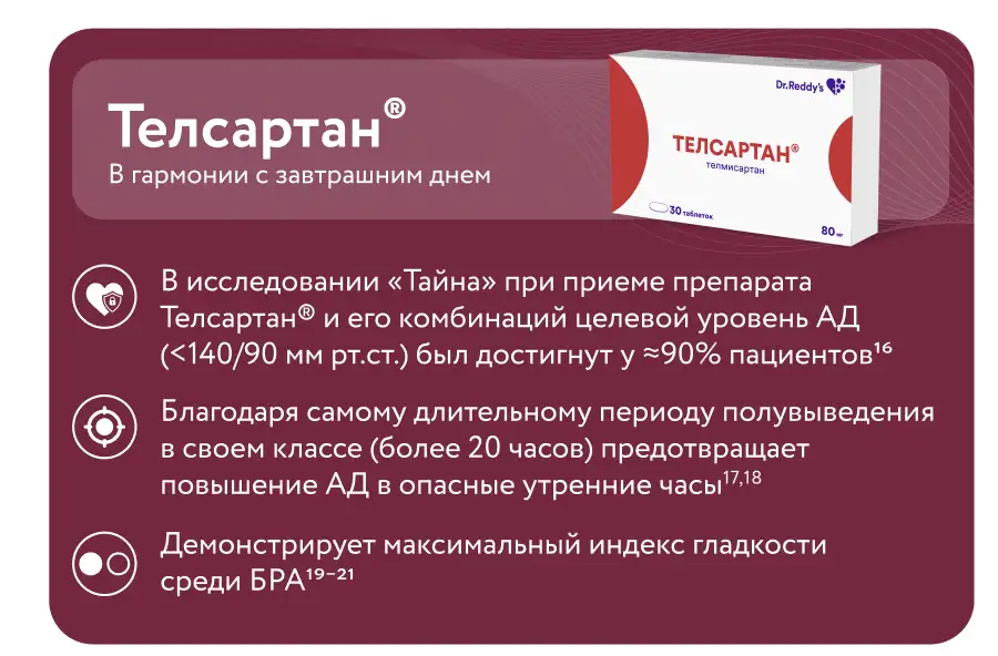 Предпочтение в терапии особенно коморбидных пациентов отдается именно фиксированным комбинациям антигипертензивных препаратов. Так, препарат Телсартан® существует не только в форме монопрепарата, но и в виде фиксированных комбинаций: Телсартан® Н (телмисартан + гидрохлоротиазид) и Телсартан® АМ (телмисартан + амлодипин).