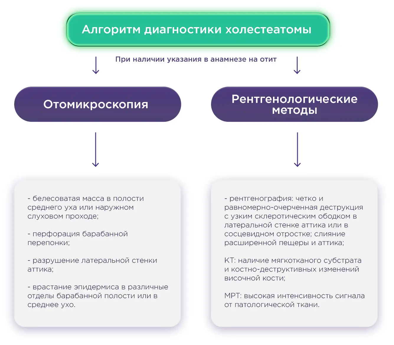 К методам выявления холестеатомы относят отоскопию (отомикроскопия) и рентгенологические методы исследования (рентгенография, МРТ, КТ)⁸.
