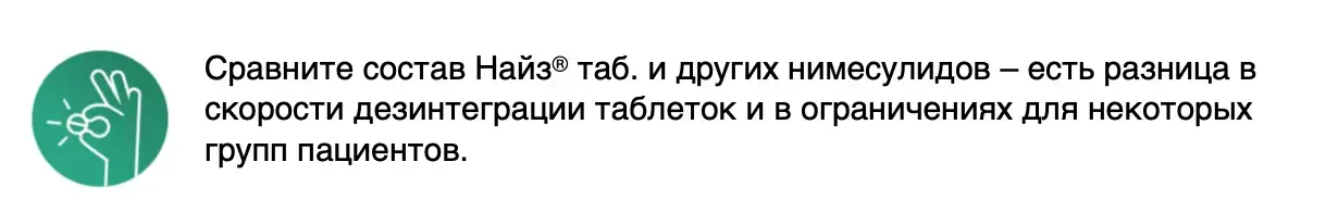 Одна из причин недостаточной эффективности лечения и сохраняющихся жалоб пациентов может быть замена препарата в аптеке. Вместо рекомендованного Найз® пациентам предлагают другой «случайный» нимесулид.