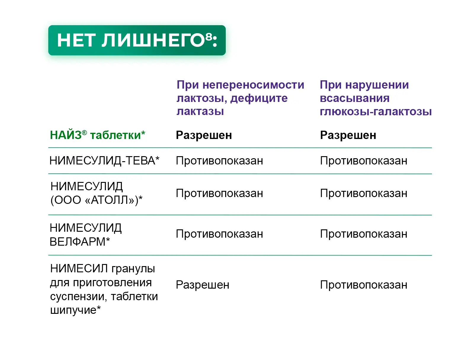 8. В составе Найз таблеток отсутствует лактоза и сахароза, см.1