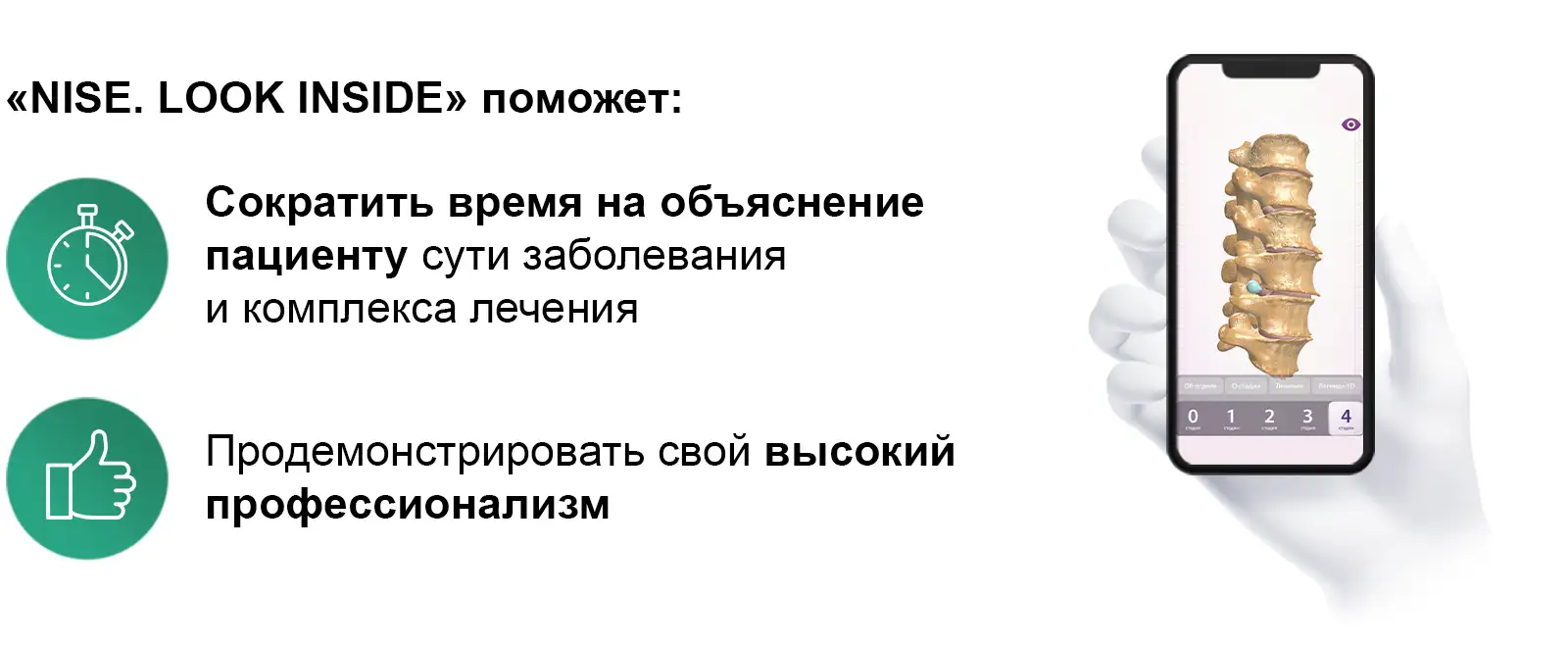 • Приложение для врачей Nise. Look Inside – наглядное пособие для демонстрации и объяснения возможного состояния пациента. С экрана собственного телефона врач может показать пациенту все стадии остеохондроза, протрузии и грыжи