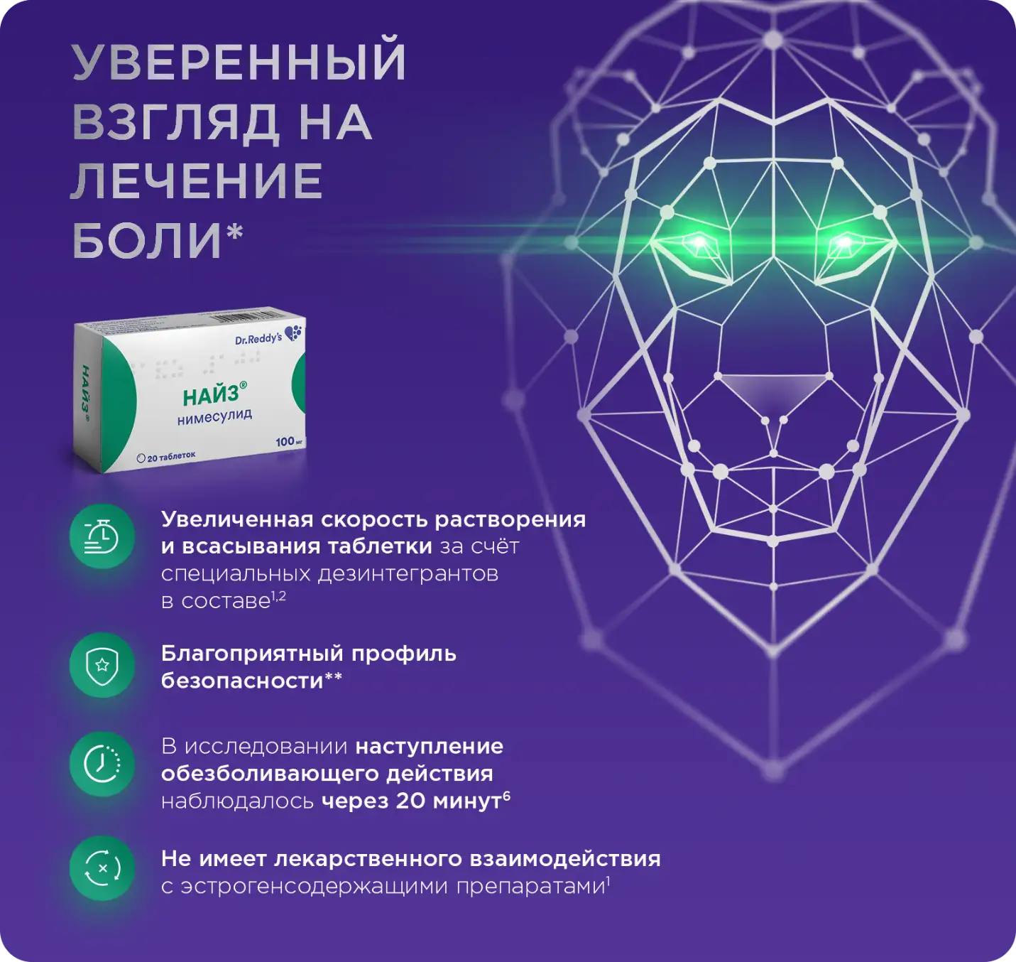 *Найз® 100 мг зарегистрирован в РФ 19.08.1998г. РУ NoП N 012824/03 и является лидером по продажам в упаковках среди нимесулидов для перорального приема, IQVIA январь-октябрь 2023, Россия; H.G. Kress, A. Baltov, A. Basiński, F. Berghea, J. Castellsague, C. Codreanu, E. Copaciu, M.A. Giamberardino, M. Hakl, L. Hrazdira, M. Kokavec, J. Lejčko, L. Nachtnebl, R. Stančík, A. Švec, T. Tóth, M.V. Vlaskovska и J. Woroń (2016). Acute pain: a multifaceted challenge - the role of nimesulide. Current Medical Research and Opinion, 2016, 32(1), 23-36. DOI: 10.1185/03007995.2015.1100986.
