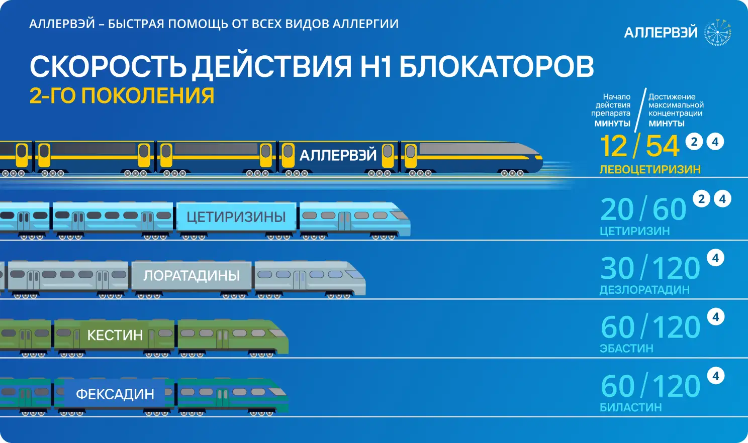 Аллервэй – современный антигистаминный препарат с самым быстрым началом действия среди АГП 2-го поколения: может быть активен уже через 12 минут, а максимальная концентрация в плазме достигается меньше, чем через 1 час – на 54 минуте. [1]