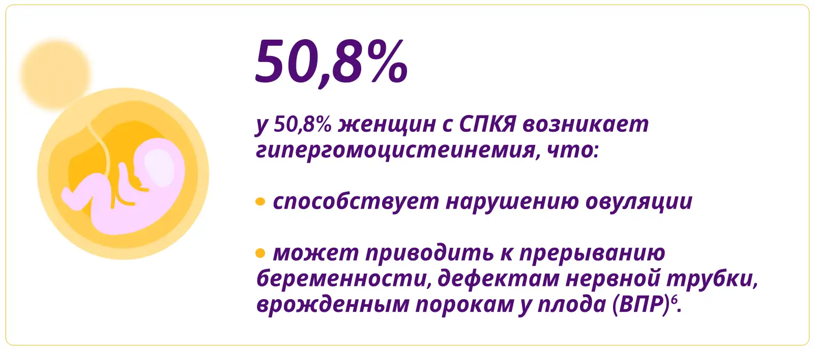У 50,8% женщин с СПКЯ возникает гипергомоцистеинемия, что: способствует нарушению овуляции, может приводить к прерыванию беременности, дефектам нервной трубки, врожденным порокам у плода (ВПР) [6].