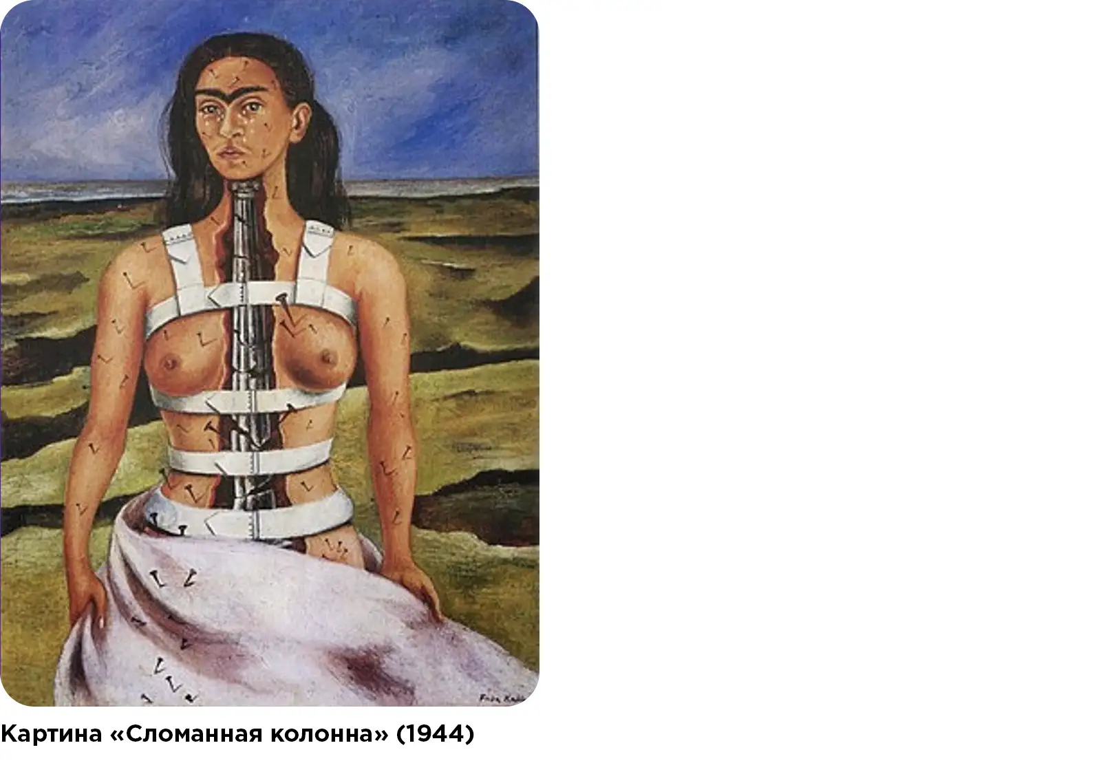 Тема хромоты и физического страдания преследовали Фриду всю жизнь. Постоянные операции и нескончаемые боли стали ее верными спутниками, что отразилось на ее творчестве. На картине «Сломанная колонна» ее тело покрыто гвоздями. Почти обнаженная уязвимая фигура с разломом посередине тела, где вместо позвоночника — рассыпающаяся ионическая колонна... [7]