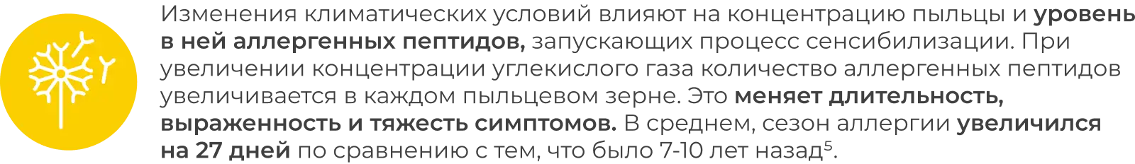 Изменение климата продлевает «пыльцевой сезон». Тяжесть реакций возрастает в связи с тем, что концентрация пыльцы в воздухе повышается на 30% и более [2]. По прогнозам, за счет повышения уровня двуокиси углерода воспроизводство растений увеличивается, и концентрация пыльцы, например амброзии, на протяжении ближайших 30 лет возрастет в 4 раза [2].