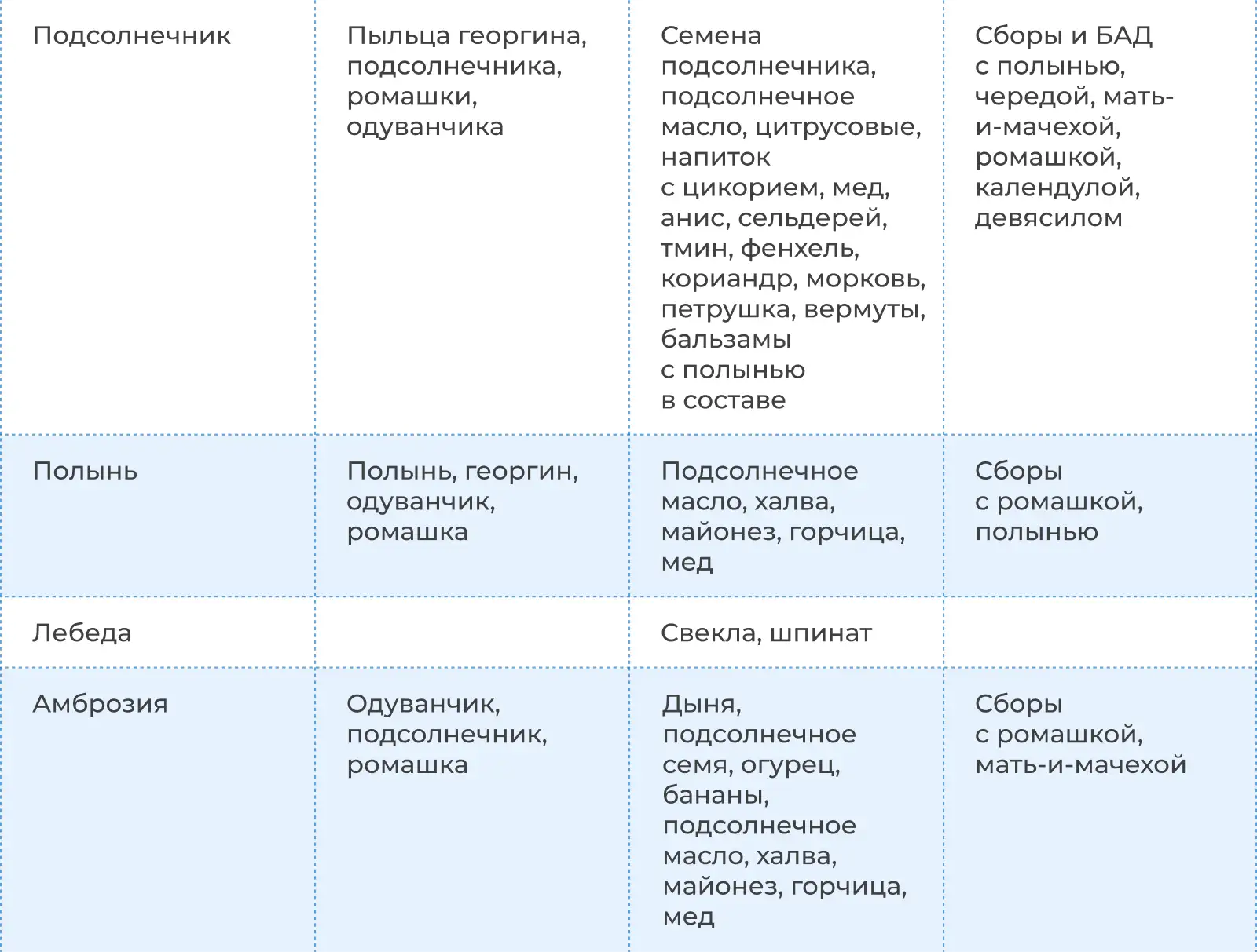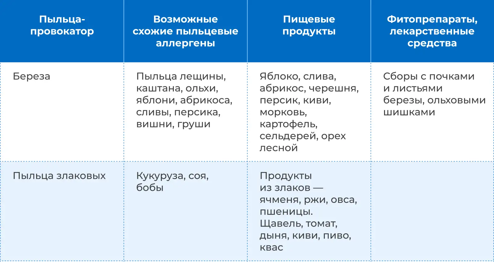 Возможность перекрестных реакций важно учитывать не только при коррекции питания пациентов с аллергией. Прием фитопрепаратов, БАДов с растительными компонентами и некоторых лекарств, а также некоторые косметологические и СПА-процедуры также могут стать триггером реакции. Сбор аллергологического анамнеза крайне важен, причем не только у лиц с поллинозом, но и с другими формами реакций.