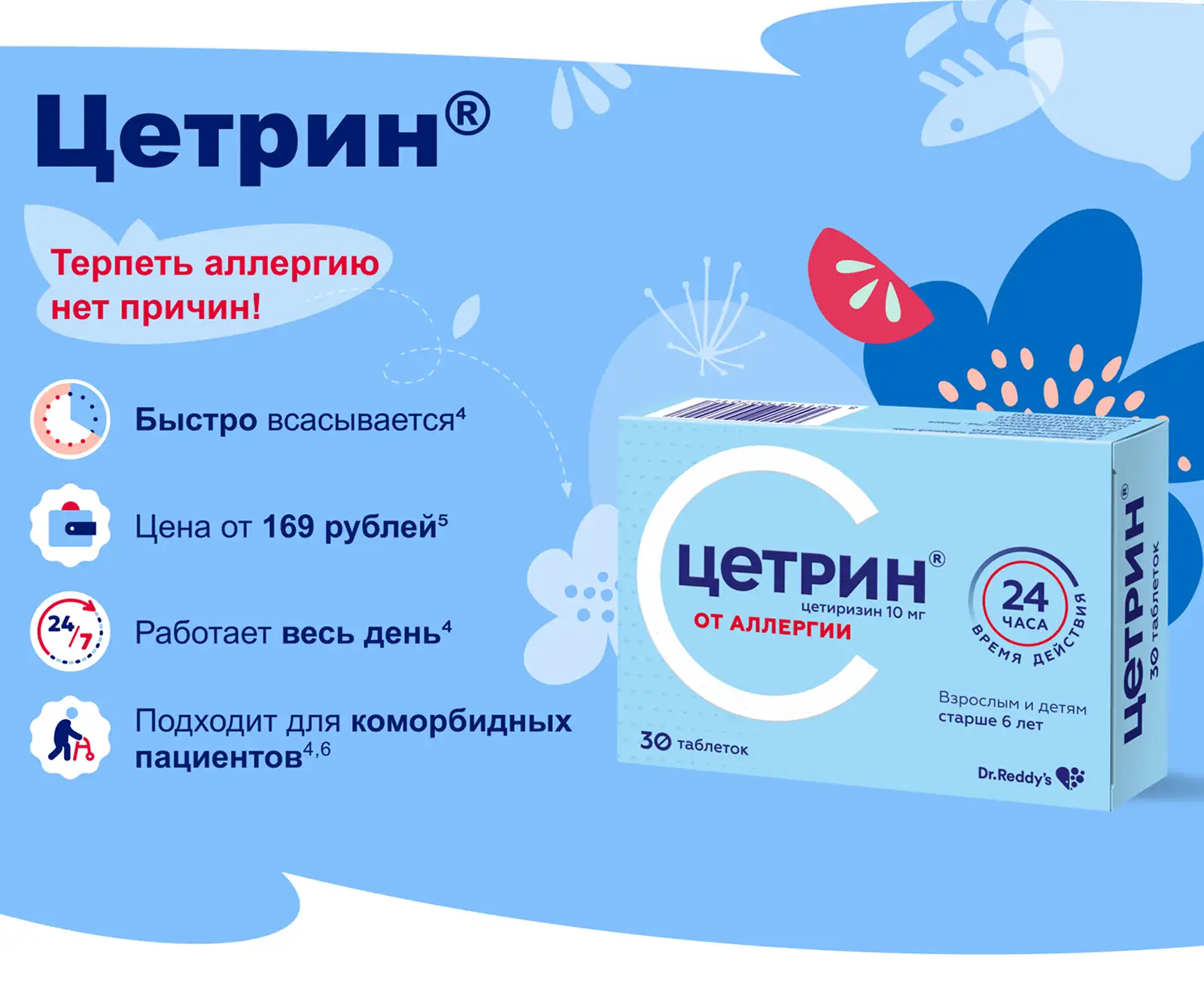 Если реакции избежать не удалось — возникли признаки конъюнктивита, ринорея, заложенность носа, кожный зуд, помочь справиться с этим состоянием может Цетрин®. Он быстро всасывается, действует на протяжении всего дня [4], помогая в облегчении кожных и респираторных проявлений, в том числе у людей с коморбидными патологиями [5].