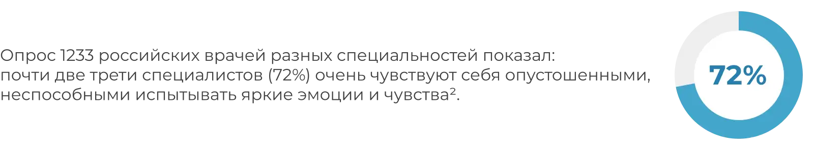 К концу дня 42% специалистов ежедневно чувствуют себя «как выжатый лимон», по утрам в рабочие дни большинство врачей отмечают у себя плохое настроение, нежелание идти на работу [2]. Это сказывается на отношениях с пациентами – 94,8% врачей, согласно этому исследованию, общаются с пациентами формально, без лишних эмоций и стараются свести общение к минимуму [2].