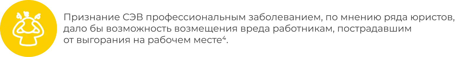 Сегодня в трудовом законодательстве понятия СЭВ нет, тем не менее тема придания синдрому юридического статуса периодически поднимается в научных работах. А публикация таких документов как Методические рекомендации «Профилактика синдрома выгорания у медицинских работников» (ДЗМ, Москва, 2018) [5] дает надежду на то, что поиск решений проблемы будет продолжаться.