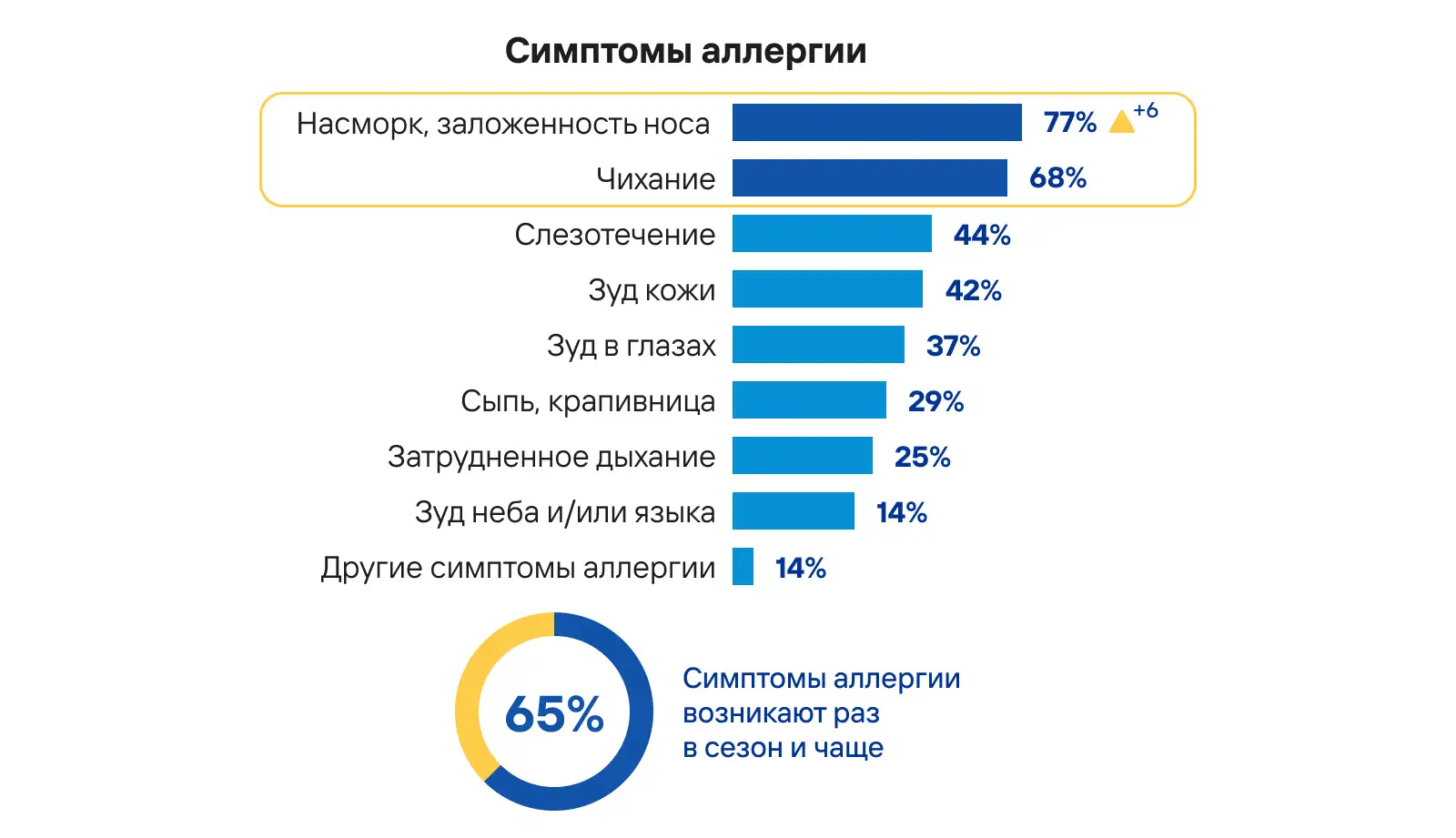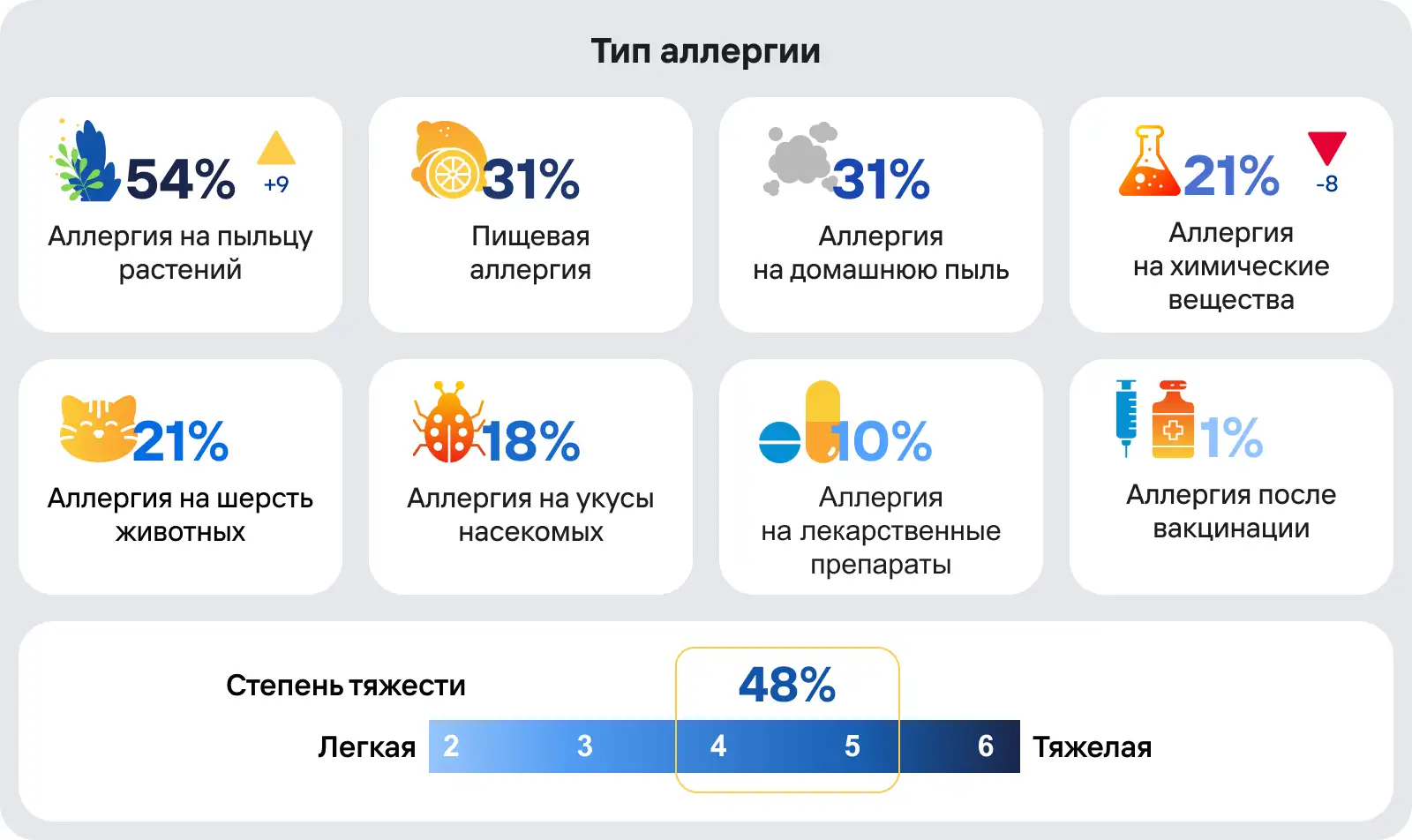 Безоговорочный лидер среди аллергенов — пыльца растений (54%), второе место делят пищевая аллергия и аллергия на домашнюю пыль3,5 (рис. 1). 48% пациентов обращаются к врачу с симптомами 4–5 степени тяжести.