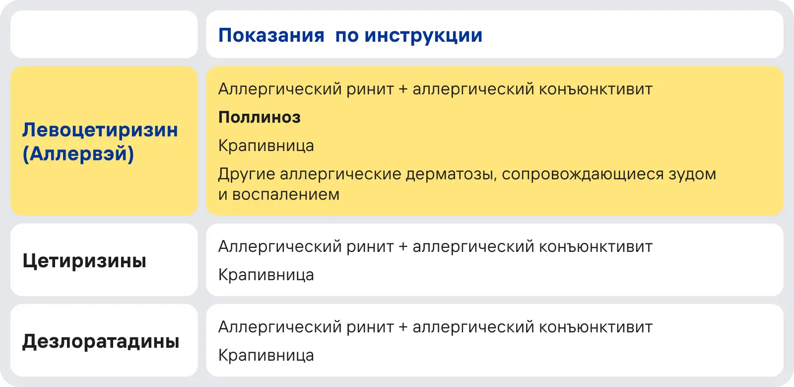 Среди препаратов II поколения особого внимания заслуживает препарат «Аллервэй». Он отличается от других препаратов своего класса тем, что может быть активен уже через 12 минут, а также может быть использован для лечения всех видов аллергодерматозов, в отличие от цетиризинов и дезлоратадинов, которые имеют более ограниченные показания (табл. 1).