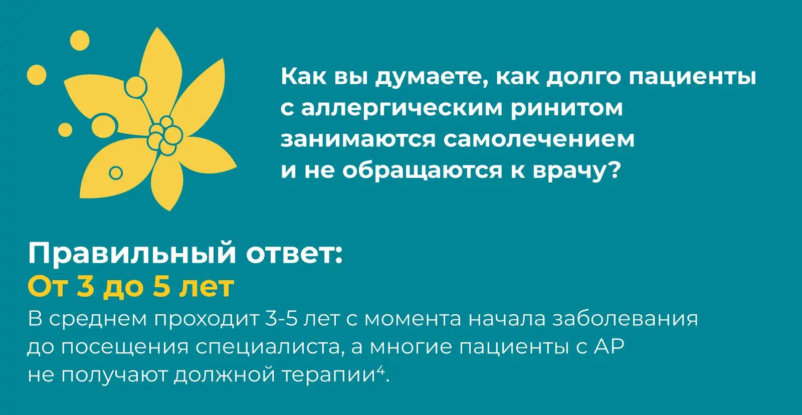 Но эти цифры могут быть существенно занижены, поскольку примерно 45% пациентов с аллергическим ринитом диагноз просто не устанавливают. Они длительное время практикуют самолечение, не обращаясь к специалистам [4].