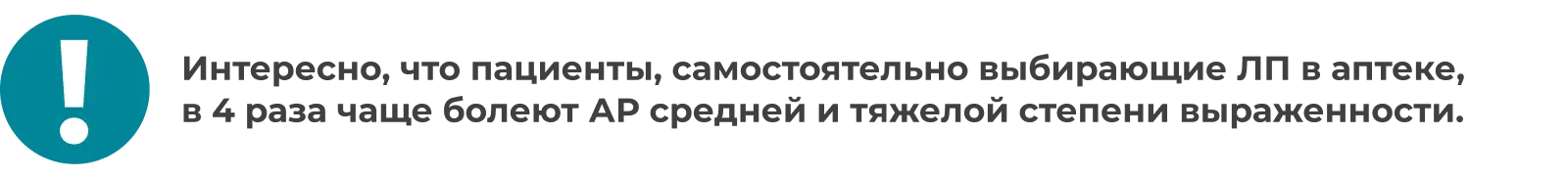 До 70% больных с АР предпочитают самостоятельный выбор безрецептурных лекарственных препаратов (ЛП) в аптеке. Но только в 15% случаев этот выбор является верным и соответствующим современным клиническим рекомендациям [7].