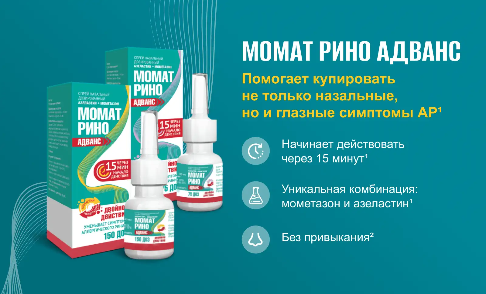 Например, можно использовать Момат Рино Адванс, сочетающий свойства азеластина (блокатора Н1‑гистаминовых рецепторов) и мометазона (глюкокортикостероид для местного применения) в одном флаконе, что дает лучший контроль симптомов и приверженность терапии благодаря удобству приема и умеренной стоимости.