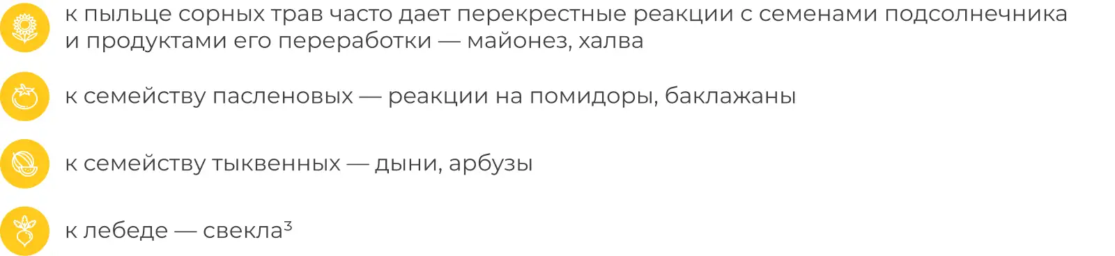 Для правильной диагностики врачу важно знать о различных аллергенах, вызывающих перекрестную реакцию, понимать особенности развития клинических проявлений, которые могут частично совпадать при пищевой и респираторной реакции [4].