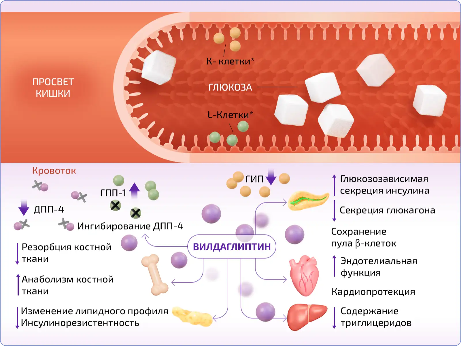 Ингибиторы ДПП-4 связывают ДПП-4, препятствуя разрушению инкретинов — глюкагоноподобного пептида и глюкозозависимого инсулинотропный полипептида. Это приводит к восстановлению первой фазы секреции инсулина и нормализации постпрандиальной гликемии. Вилдаглиптин — один из наиболее изученных высокоселективных ингибиторов ДПП-4. Его особенность в быстром образовании комплекса «фермент-ингибитор» с последующей медленной диссоциацией, что позволяет дольше сохранять гликемический контроль [7].