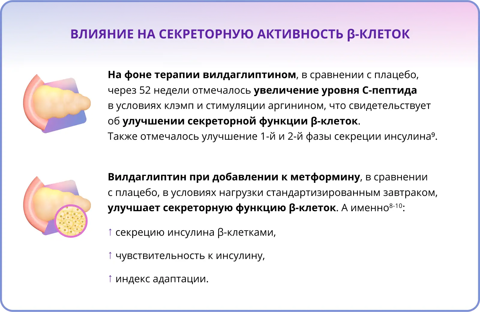 Комбинация вилдаглиптин + метформин — патогенетически обоснованная оптимальная комбинация ЛС с адекватным терапевтическим эффектом [3,8]: