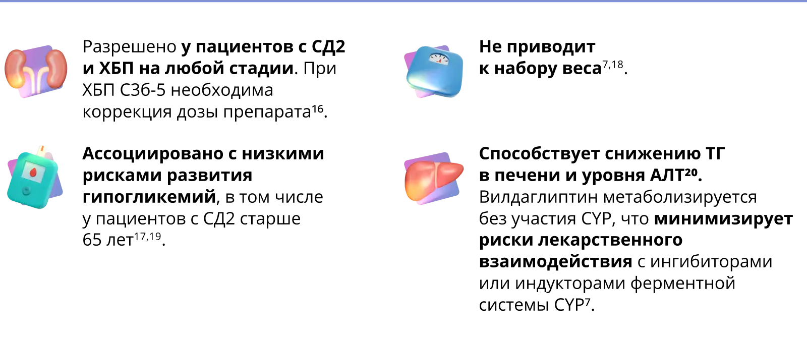 Вилдаглиптин и комбинация вилдаглиптин/метформин (Галвус® и Галвус Мет®) являются надежными ПССП, механизм действия которых влияет непосредственно на патогенез развития СД2 и позволяет замедлить прогрессирование заболевания. Вилдаглиптин обладает хорошим профилем безопасности и доказанной эффективностью, как в качестве монотерапии, так и в комбинации с метформином.