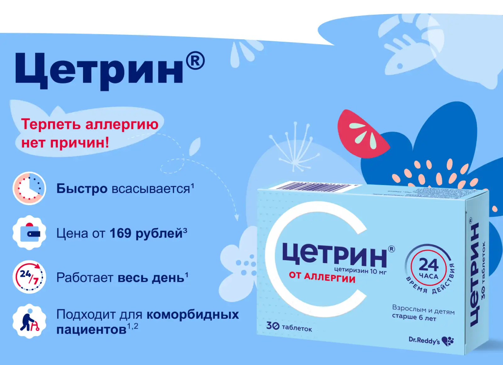 Особенность Цетрина® в том, что он накапливается в коже в высоких концентрациях, купируя кожные симптомы аллергии за 20 минут после применения. Цетрин® облегчает аллергические реакции, устраняет зуд и кожную реакцию на аллергены и охлаждение (при холодовой крапивнице) [1,11].
