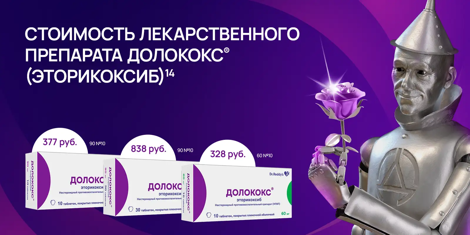 Среди НПВП эторикоксибы набирают все большую популярность, в частности, Долококс®. Он является высокоселективным препаратом в отношении ЦОГ-2 с высокой биодоступностью и обладает дозозависимым эффектом [13], что позволяет контролировать как острую, так и хроническую боль.