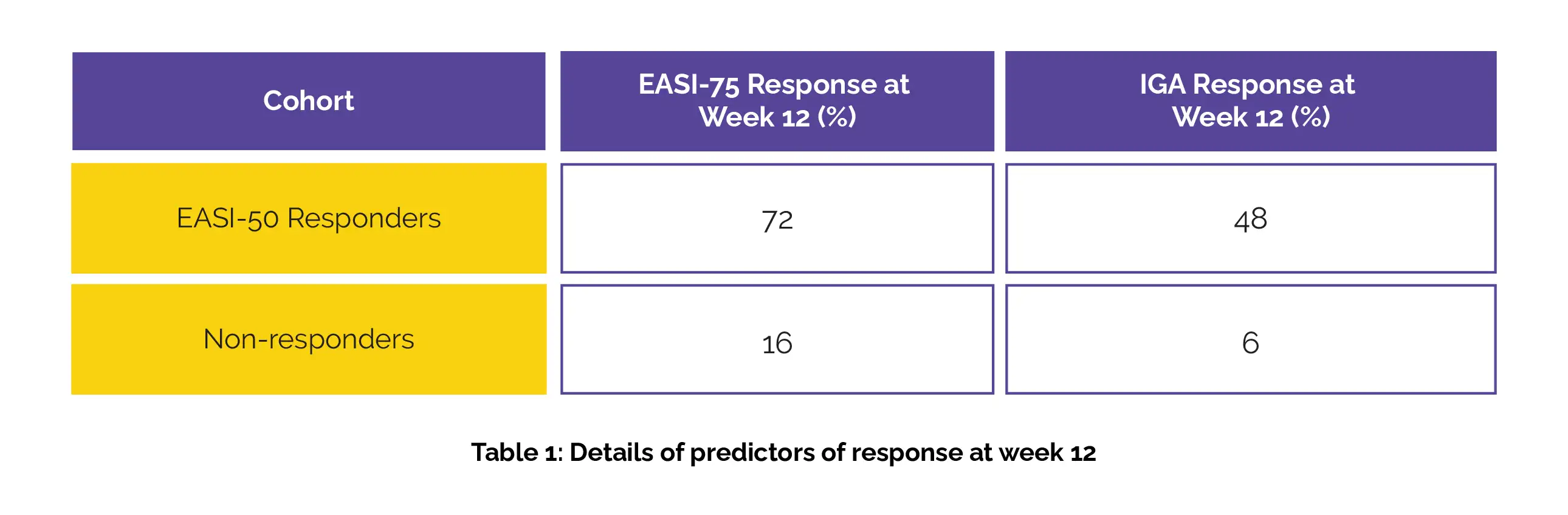 The outcomes for the training group (number of patients = 453) based on EASI-50 responders and non-responders at week 4 with Abrocitinib 100 mg, showing the percentages of EASI-75 and IGA responses at week 12, are provided in Table 1 below: