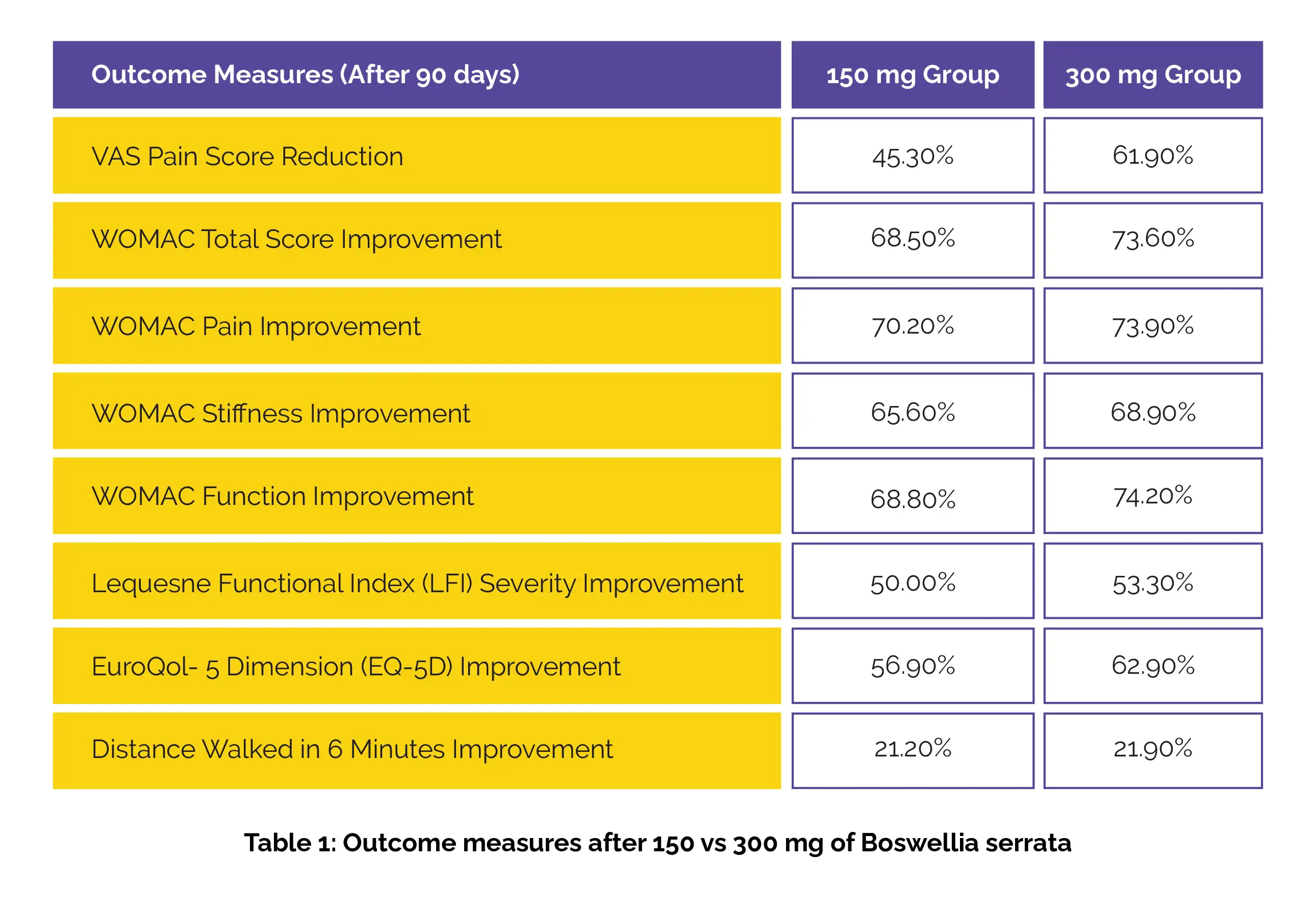 Additionally, inflammatory biomarkers and safety were also assessed in this double-blind, placebo-controlled study. Ninety-eight subjects completed the study. Pain score betterments were witnessed as early as five days after starting the supplement in both the 150 mg and 300 mg groups. After 90 days, participants taking Boswellia serrata experienced notable improvements in pain, function and mobility as shown in Table 1 below.