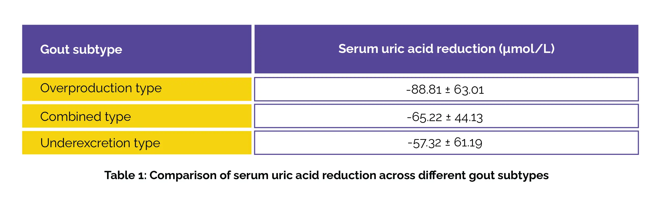 Even after adjusting for age, BMI, baseline serum uric acid, and estimated glomerular filtration rate (eGFR), pivotal differences in serum uric acid reduction persisted across the different gout subtypes.