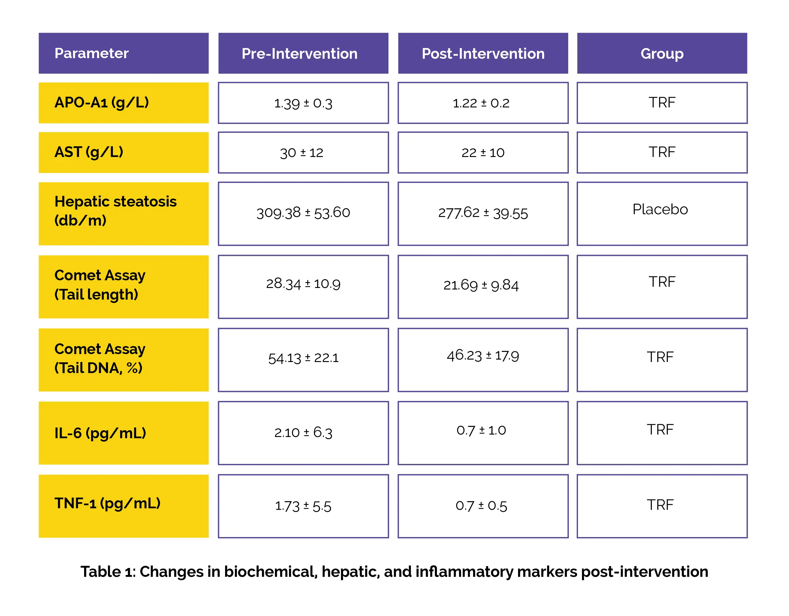 Researchers monitored various health markers, including liver function, DNA damage, and inflammatory cytokines. Apolipoprotein-A1 (APO-A1) and aspartate aminotransferase (AST) levels dropped substantially in the TRF group. Significant reductions were observed in DNA damage parameters for those taking TRF. Levels of pro-inflammatory cytokines interleukin (IL)-6 and tumor necrosis factor-alpha (TNF-α ) also decreased considerably in the TRF group. However, TRF did not markedly improve hepatic steatosis as opposed to the placebo group (Table 1).